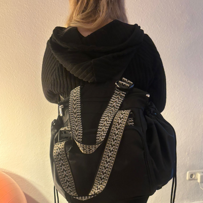 Die Tasche bietet vielseitige Tragemöglichkeiten: Sie kann als Rucksack getragen werden, am oberen Griff wie eine Handtasche oder dank gepolsterter, verstellbarer Gurte individuell angepasst werden. Die farbigen Schultergurte verteilen das Gewicht gleichmäßig für angenehmen Tragekomfort.
